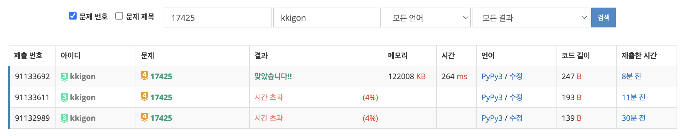 근데 이렇게 하면 될 것 같지만 시간초과가 난다. C로 푼 사람들은 여기까지만 해도 될 것 같은데, 이 문제에 제한시간에 추가시간이 없고 무조건 1초여서 파이썬은 약간의 최적화를 해줘야 한다.