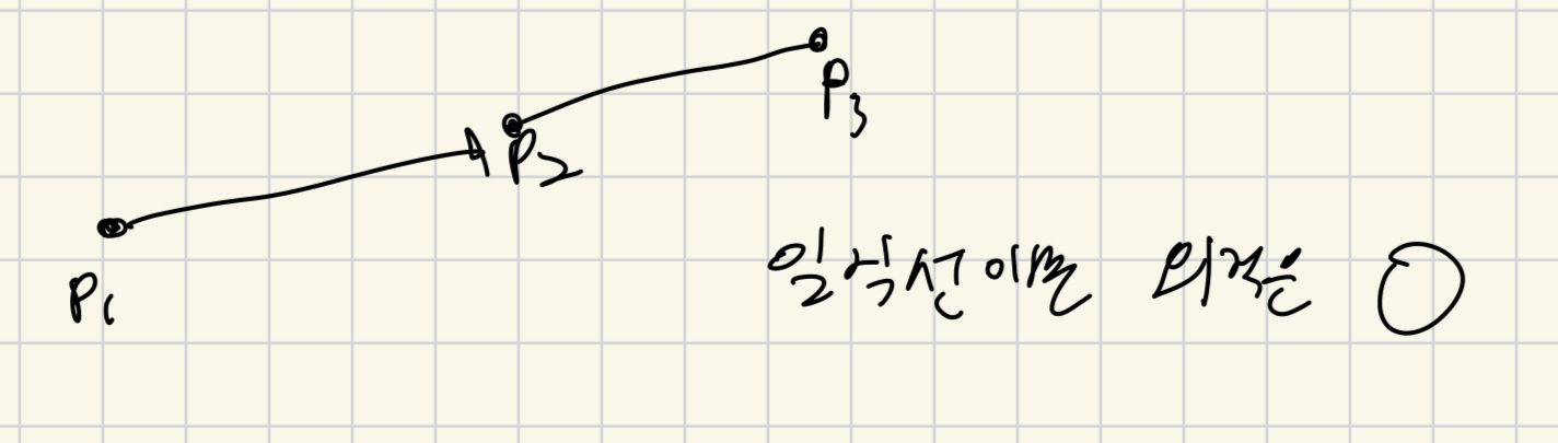 만약 세 점이 일직선이어서 벡터들끼리 평행한 경우는 외적이 0이라고 할 수 있다.