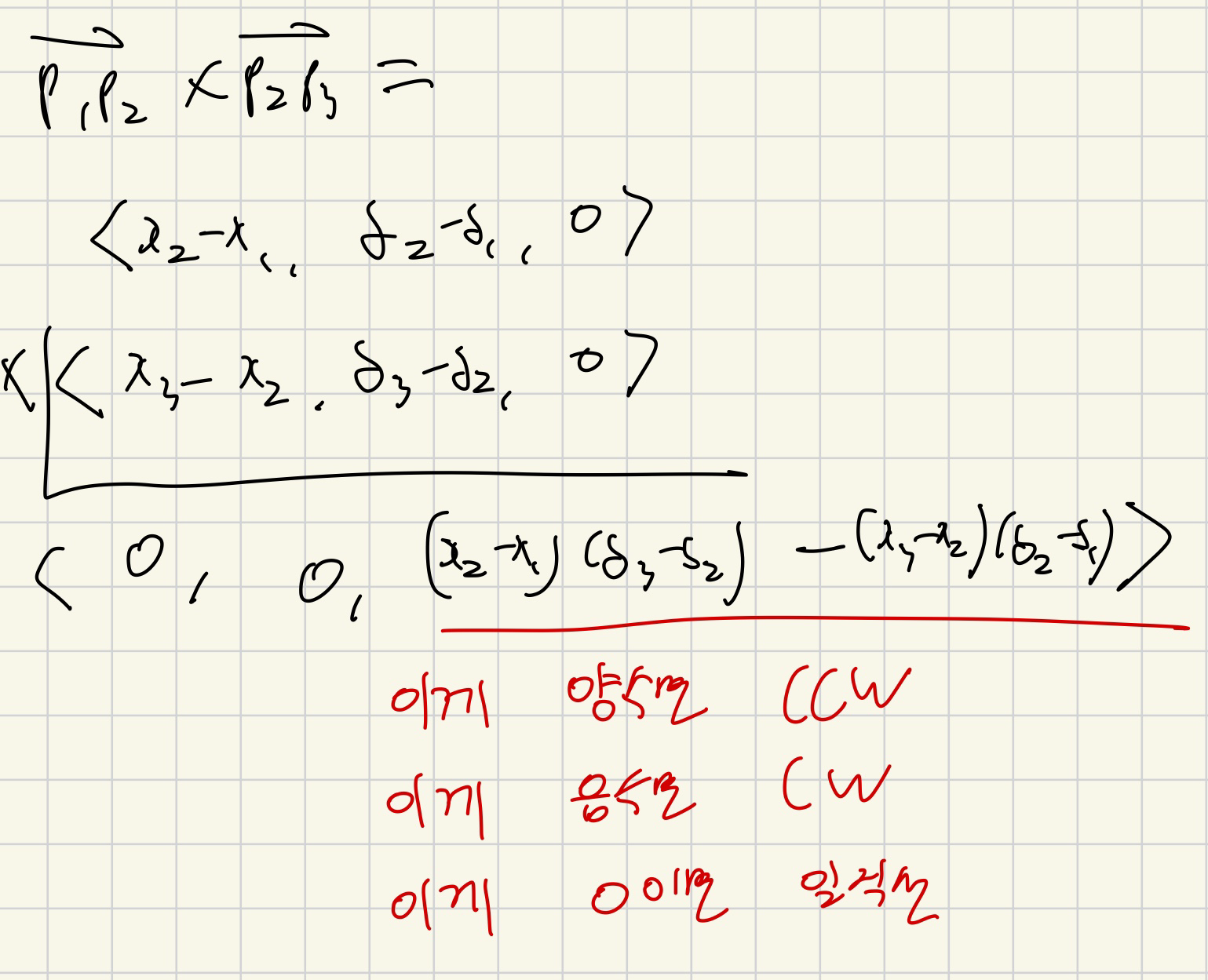 밑줄친 부분이 +z 방향을 나타내니, 이 값이 양수면 CCW, 음수면 CW, 0이면 일직선이 될 것이다.