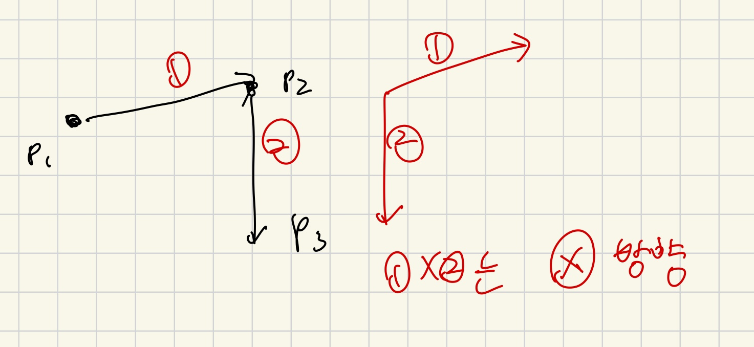 P1P2 벡터와 P2P3 벡터의 외적을 생각해보자. 반시계 방향일 경우 두 벡터의 외적은 종이를 뚫고 나오는 방향, 즉 +z 방향이다.
