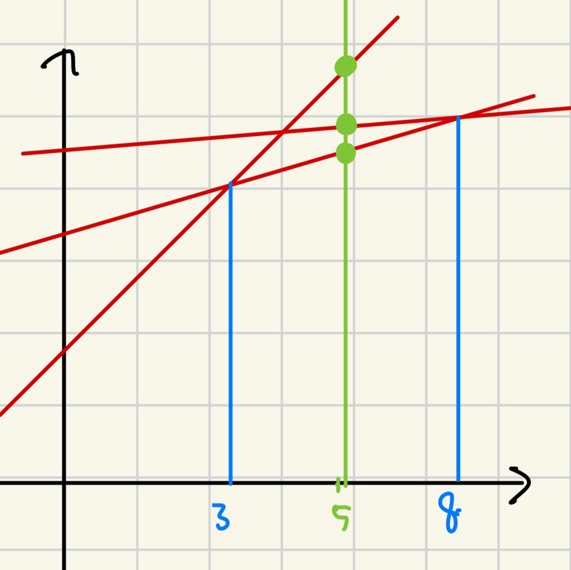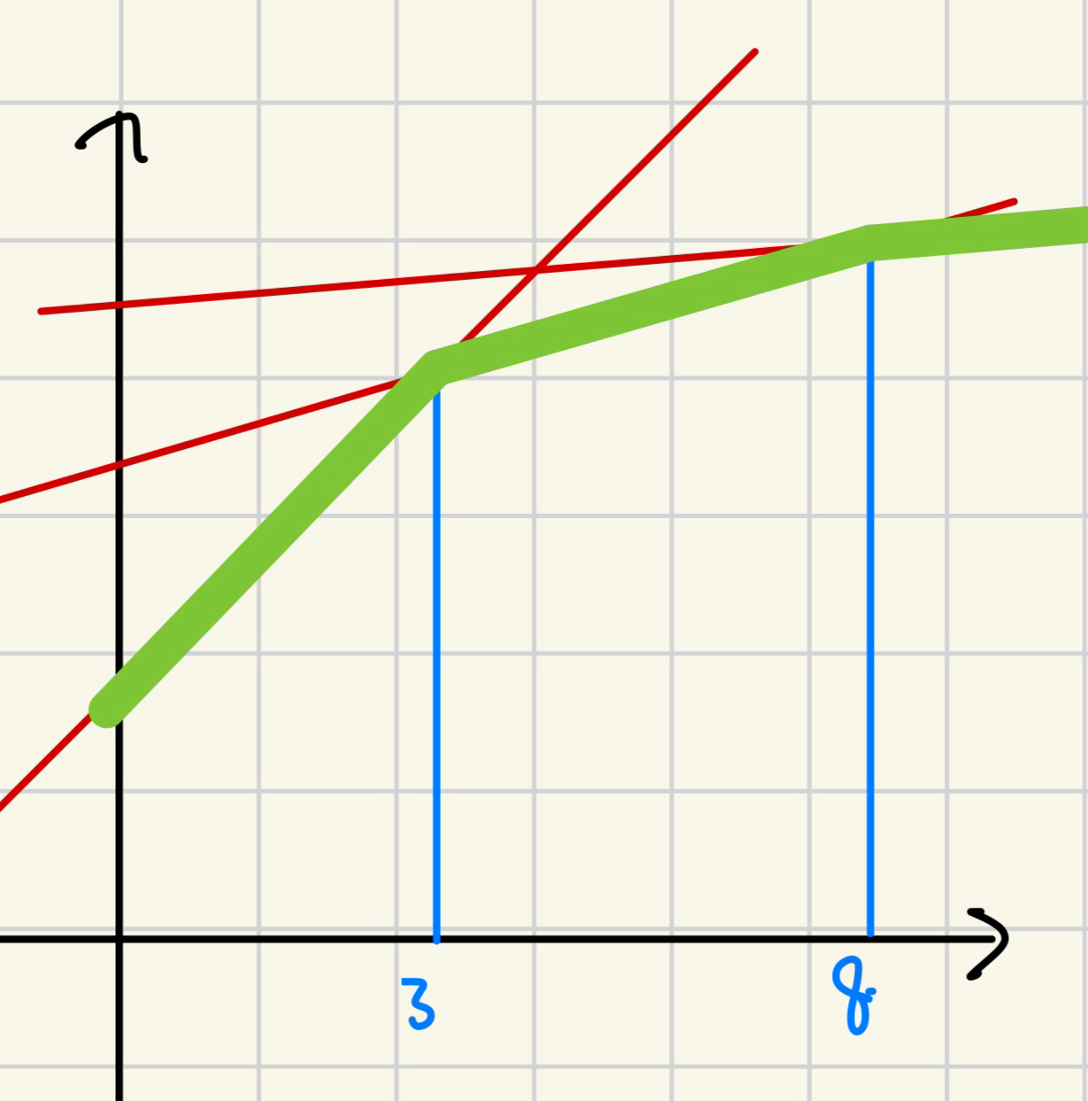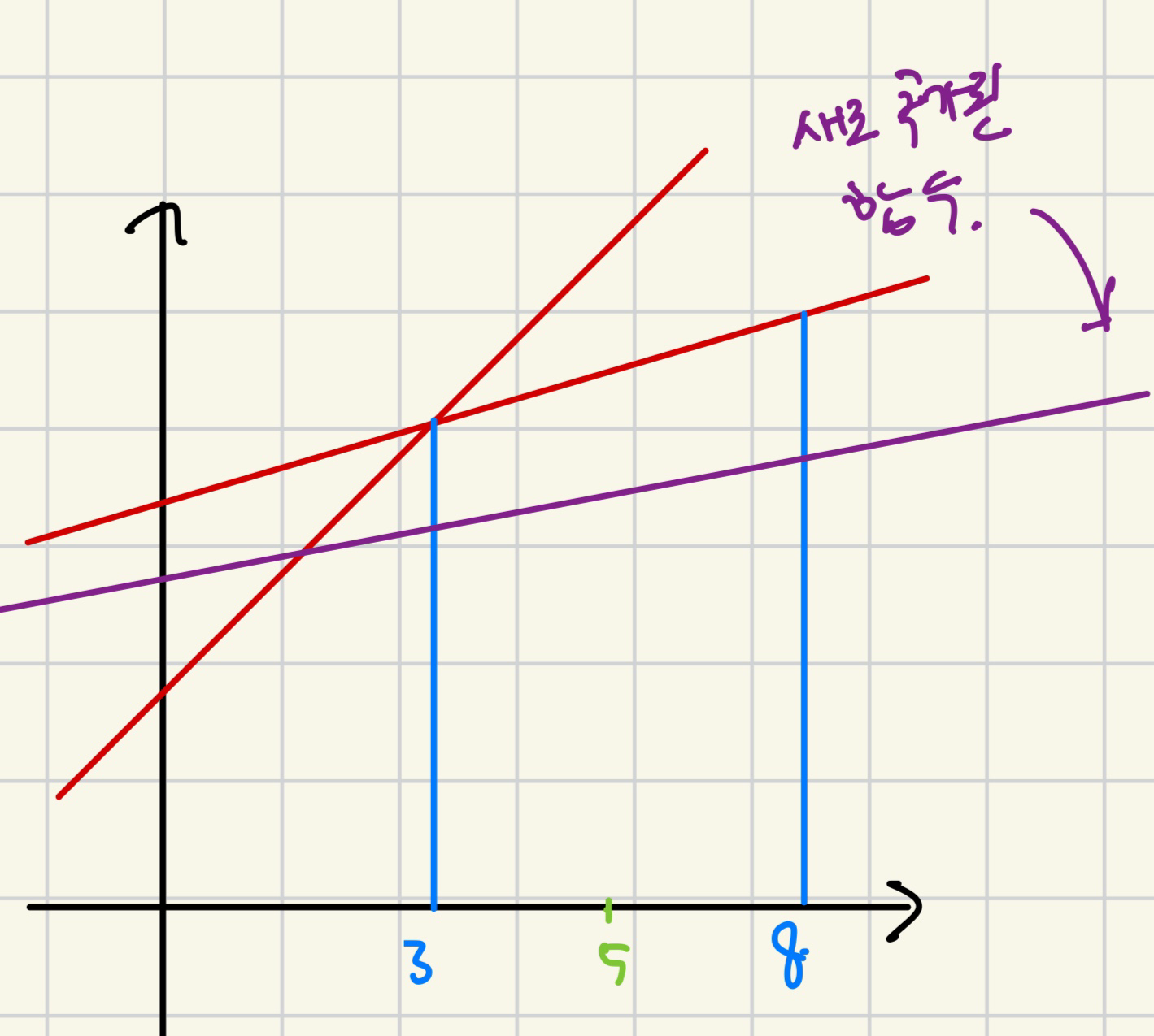 x = 5에서는 일차함수가 3개가 정의되고, 그림처럼 생긴 3개의 점 중에서 최소의 점을 갖는 일차함수를 선택하면 될 것이다.