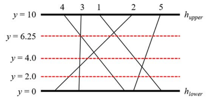 For example, 5 segments and 3 query lines are given in the plane as shown in the figure below. The leftmost segment that intersects with a query line of y = 2.0 is 2 and the leftmost segment that intersects with a query line of y = 4.0 is 3. The query line of y = 6.25 crosses the intersection point between the segments 3 and 4, hence the leftmost segment is 4 by definition.