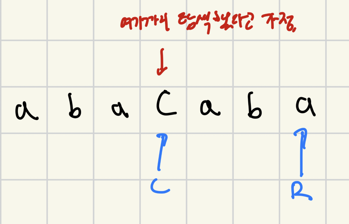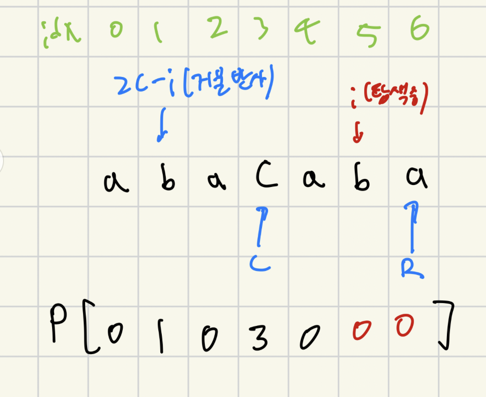P[i] = min(R - i, P[2*C - i])라고 일단 해줄 수 있다. 일단 해두었다는 것은 이것이 최대 길이가 아닐 수 있다는 것이다.