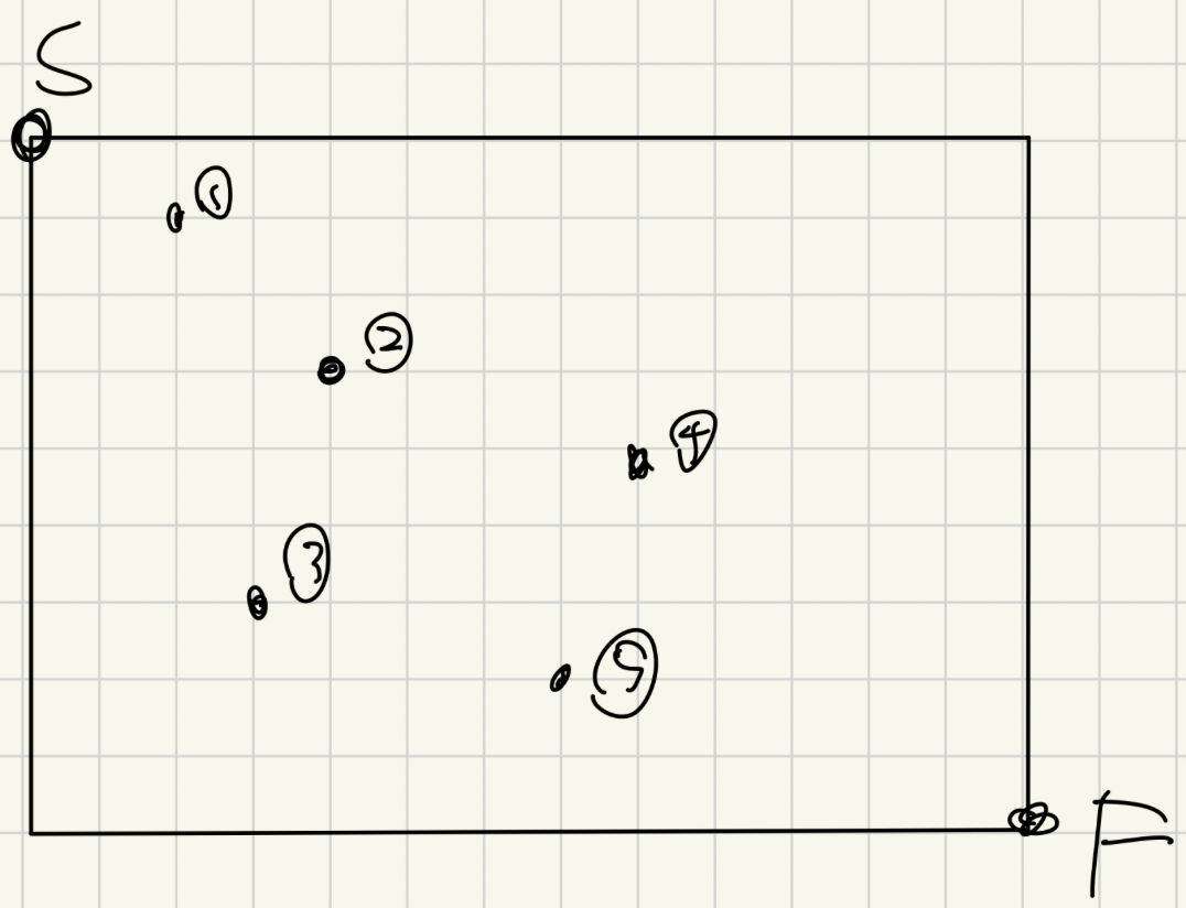 각 폭탄에 대하여 여사건을 해주면 될 것 같지만, 그러면 S-1-2-4-F와 같이 여러 폭탄을 지나는 경로가 겹쳐져서 세진다.