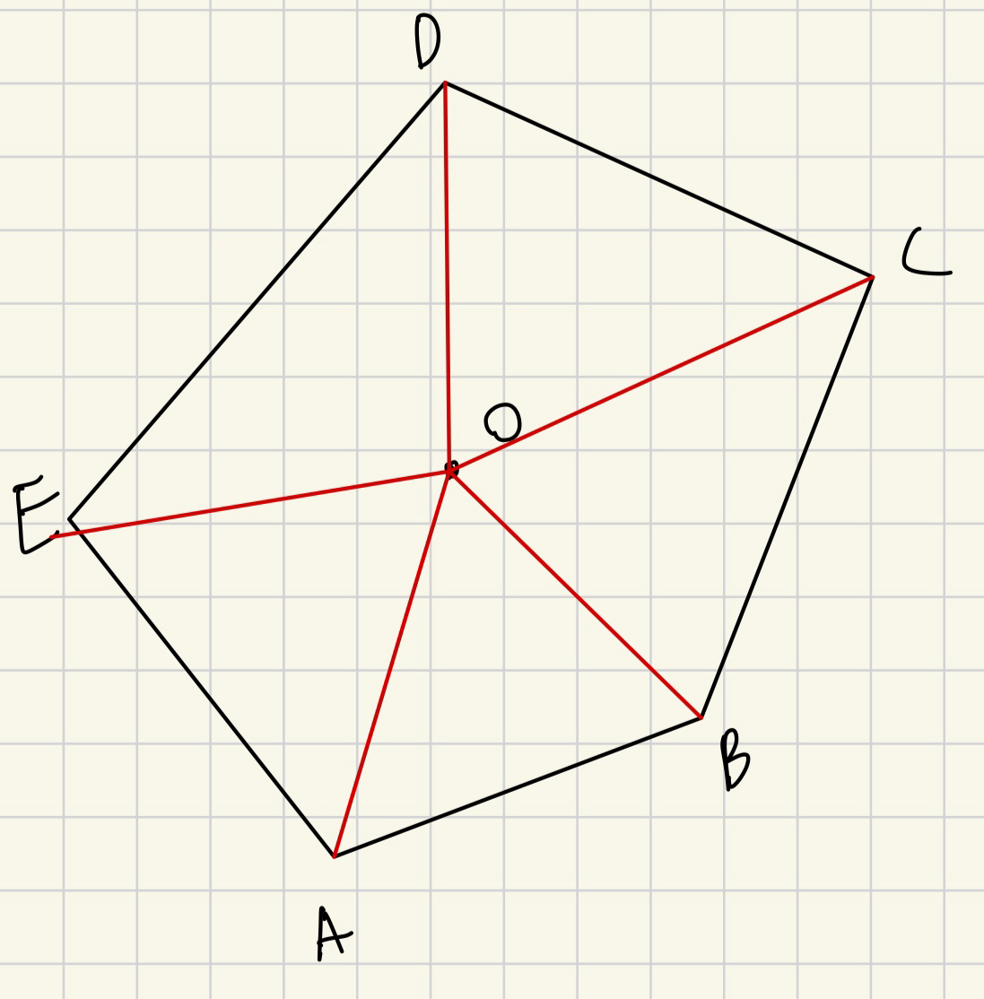 그러면 오각형의 넓이는 다음과 같이 삼각형 5개로 쪼갤 수 있다.