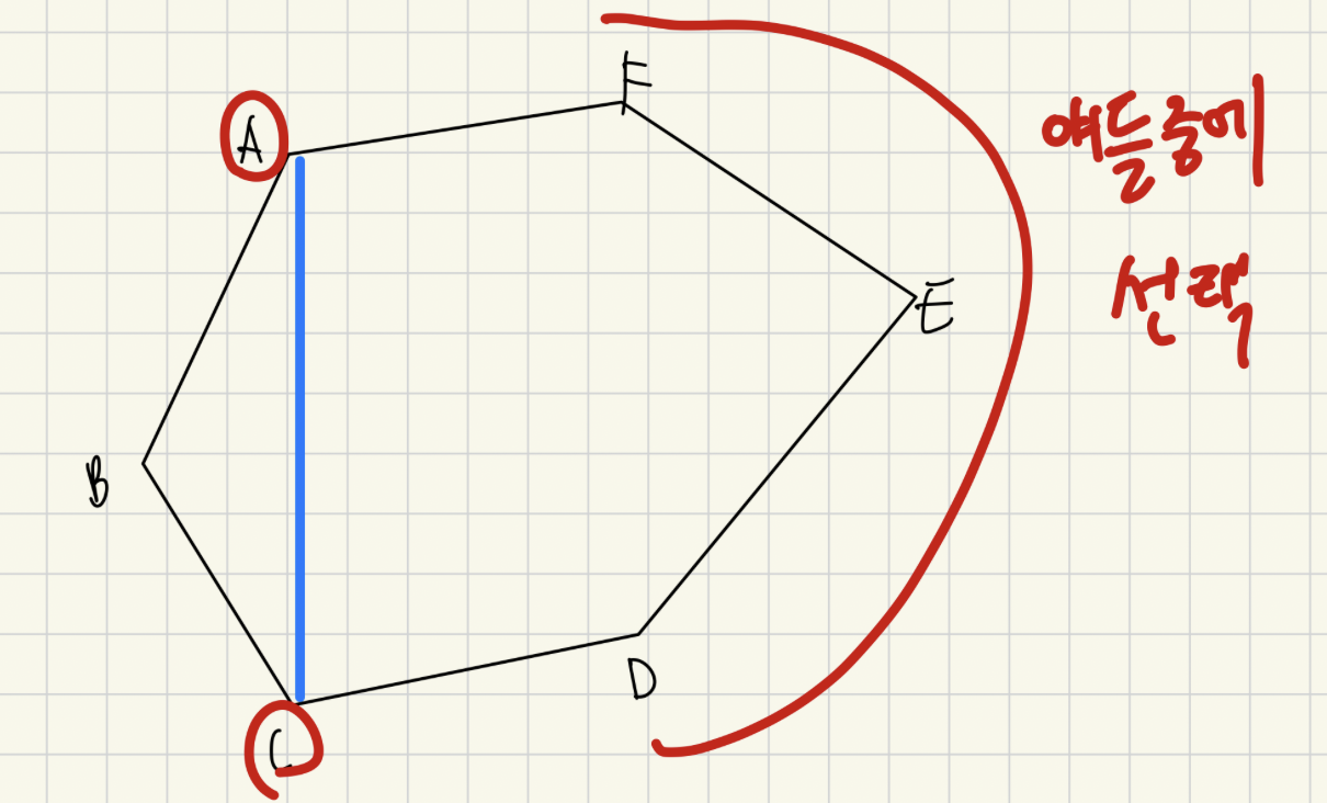 점 A와 점 C 사이(ABC 구간)에서는 A, C말고 달리 선택된 점이 없어야 한다. 즉, A와 C가 이웃한 경우만 보자.