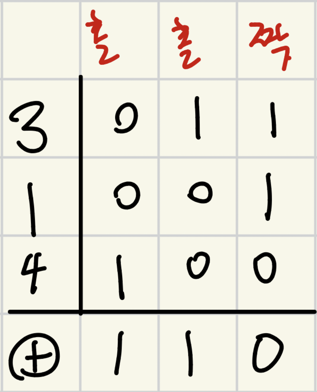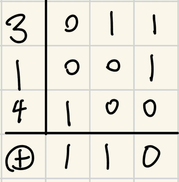 님 합(XOR)의 특성상, 세로로 각 자리수를 보았을 때 1이 홀수 개 있으면 최종적인 비트가 1이 되고, 짝수 개 있으면 0이 됨을 알 수 있다.