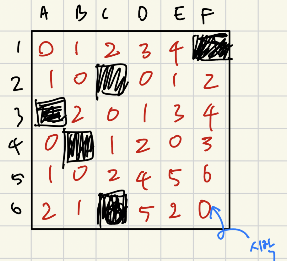가장 먼저, 왼쪽 위(A1)은 더 이상 이동 불가능하므로 그룬디 수가 0이다.