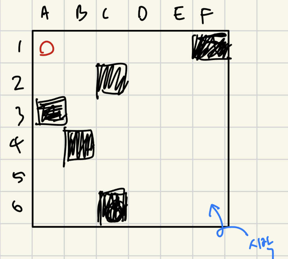 정사각형 모양의 체스판이 있으며, 판 중간중간에 장애물이 있다.