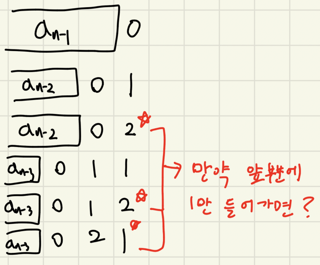 근데 그냥 단순히 $a_{n}=a_{n-1}+2\times a_{n-2} +3\times a_{n-3}$ 라고 표현하면 빨간 글씨처럼 '누락되는 부분'이 있다.