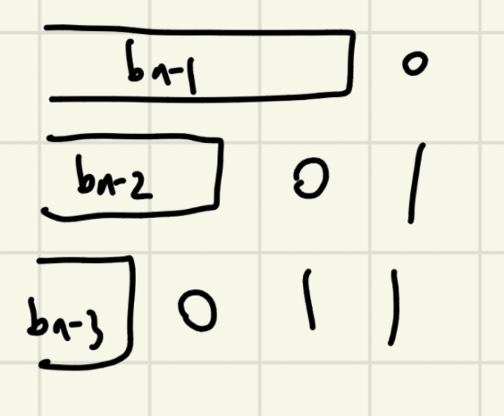 그래서 이 케이스를 따로 더해주기 위해, 0과 1로만 이루어지면서 조건을 만족하는(2가 반드시 포함되어야 한다는 조건 제외) $b_n$을 따로 구하자.