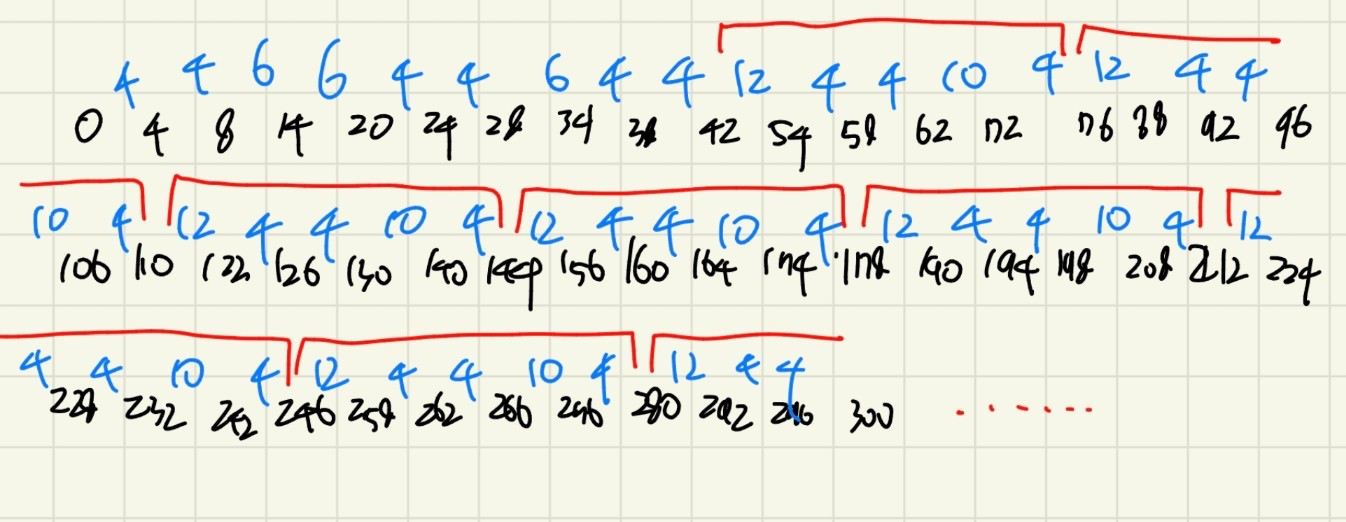 파란색으로 인접한 두 수의 차이를 적어보면, 42 이후로부터 +12, +4, +4, +10, +4가 반복됨을 알 수 있다.