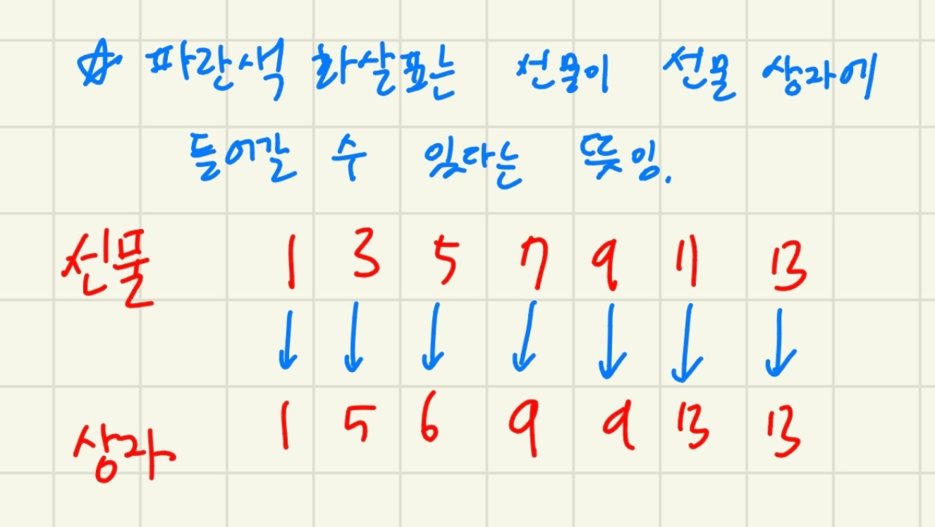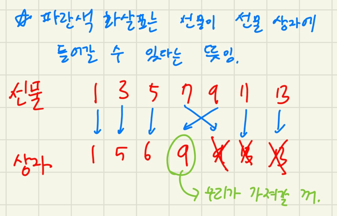 선물의 크기가 상자의 크기 이하여서 상자에 들어갈 수 있는 경우를 파란색 화살표로 표현하였다.